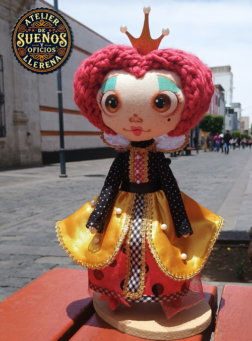 Cada detalle de esta pieza ha sido creado con dedicación: desde su cabello rojo vibrante y su cinta de lazo hasta su vestido decorado con naipes que nos transporta a la corte de la Reina de Corazones.